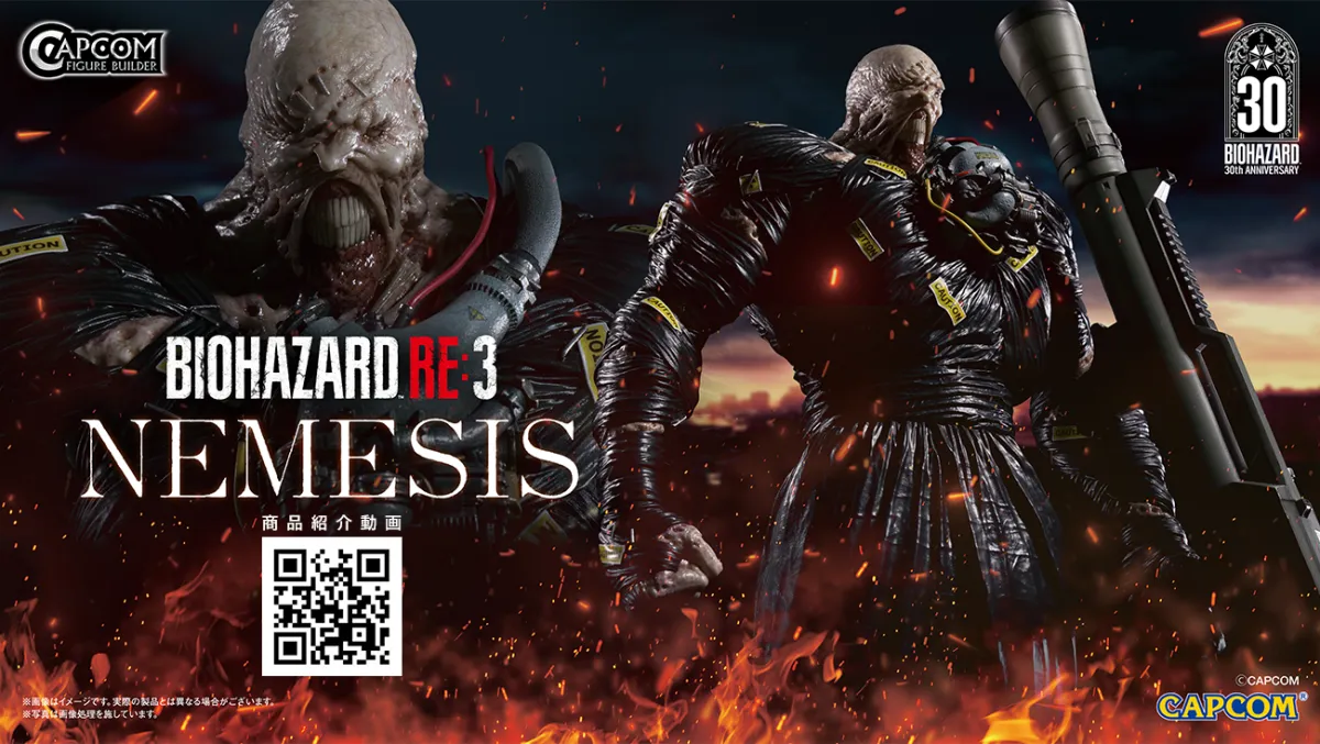 まず初めにご紹介するのは、『バイオハザード RE:3』から登場する1/6スケールのクリエイターズモデル「ネメシス」です。このフィギュアは、バイオハザード30周年を記念して制作されており、両腕の交換オプションが付属しているため、様々なポーズを楽しむことができます。ネメシスの輸送筐体デザインの台座も含まれ、さらに特別に、原作ファンにはたまらない頭部交換用パーツも用意されています。