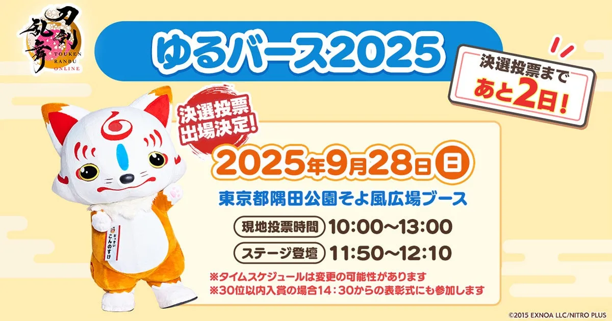 ゲーム『刀剣乱舞ONLINE』の人気キャラクターであり、宣伝隊長の「おっきいこんのすけ」が、2025年9月28日(日)に東京都墨田区で開催される日本最大のキャラクターイベント「ゆるバース2025」の決選投票に参加することが決まりました。