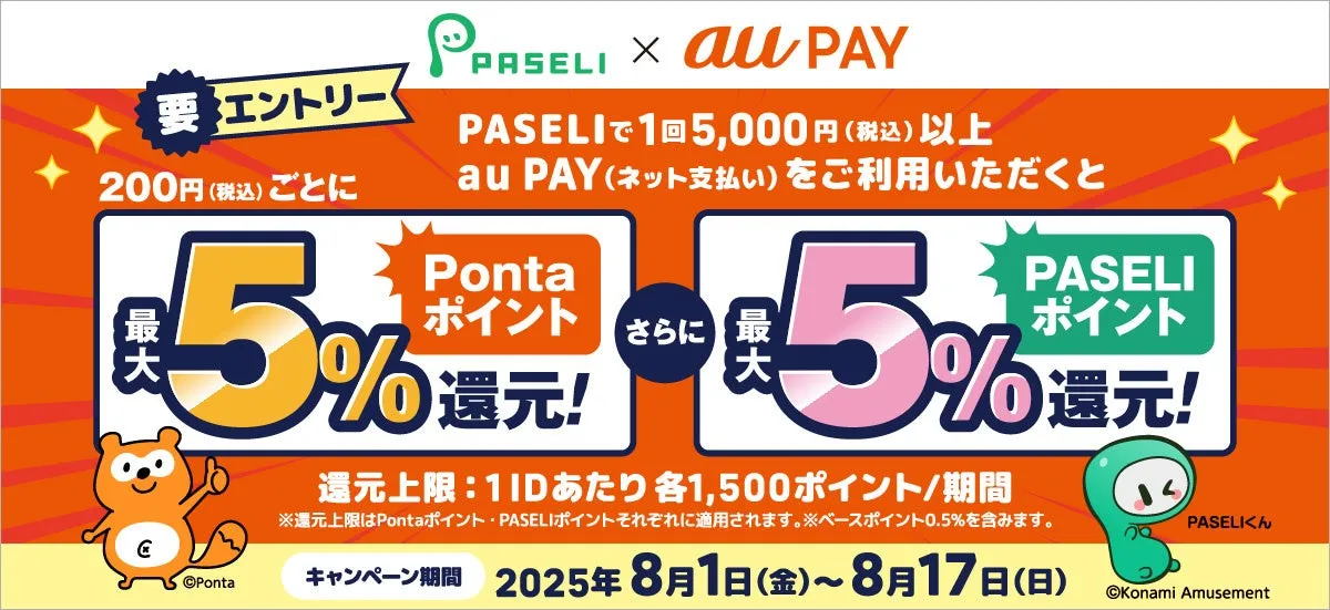 キャンペーンは2025年8月1日から8月17日までの期間限定で実施されており、エントリーが必要です。参加方法は簡単です。まず、専用サイトからエントリーした後、「PASELI」を使って1回5,000円以上を「au PAY」のネット決済にて支払うだけ。これにより、税込200円ごとに「Pontaポイント」と「PASELIポイント」が最大5%還元されるという嬉しい特典があります。