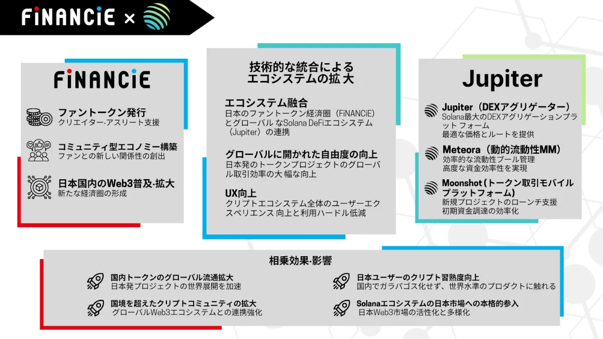 両社のエコシステムを接続することで、フィナンシェとJupiterは「日本発のIPトークン」と「グローバルなDeFi基盤」の融合を実現します。これにより、これまで国内でのみ取引されていたトークンが、オンチェーン技術を利用して国際市場に解放されることになります。これが、取引の自由度とトークンのスケールを向上させる目的です。