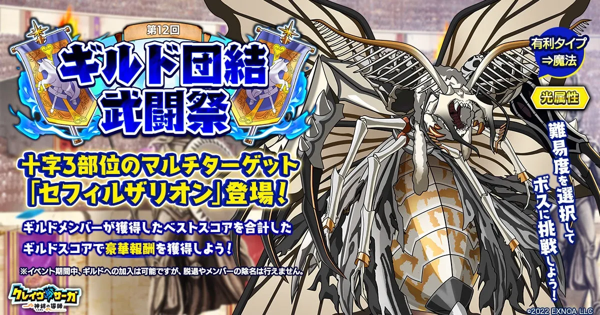「ギルド団結武闘祭」では、光属性のボス「セフィルザリオン」が待ち受けています。魔法有利の十字3部位を持つボスと戦うためには、ギルドメンバーの協力が必須です。イベントを通じて、スコアを累計して報酬を獲得しましょう。使用できる「ギルドバッチ」を集めることで、SSR武器と交換できる特別な交換所も用意されています。