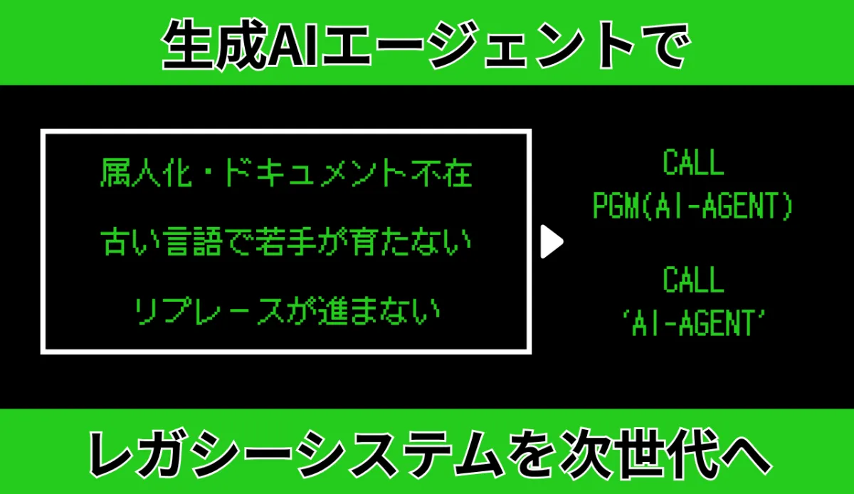 ジーニーズでは、汎用機やオフコンの開発における豊富な経験と最新の生成AI技術を組み合わせ、レガシーシステムの問題に立ち向かいます。このアプローチは、従来の「人の力」に依存する方法から進化し、生成AIエージェントを活用する新しい形の解決策を提供します。