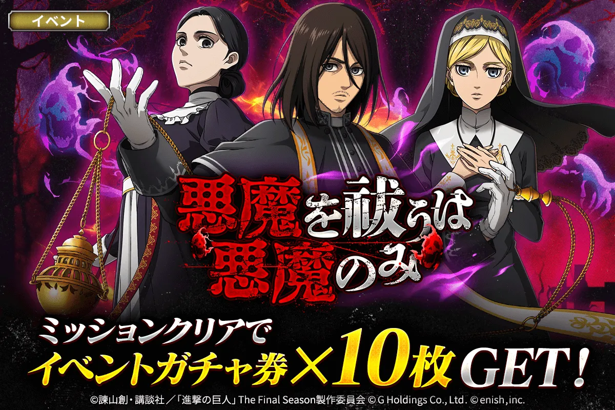 株式会社enishが手がける人気スマートフォンゲーム「進撃の巨人Brave Order」の新たなイベント「悪魔を祓うは悪魔のみ」が、2025年7月11日より開催されます。このイベントでは、アニメ「進撃の巨人」から新たに登場するキャラクターが魅力的なピックアップガチャとして登場。具体的には、【悪魔祓い】エレン・イェーガー、【悪魔祓い】ヒストリア・レイス、【悪魔祓い】ラーラ・タイバーがラインナップされています。
