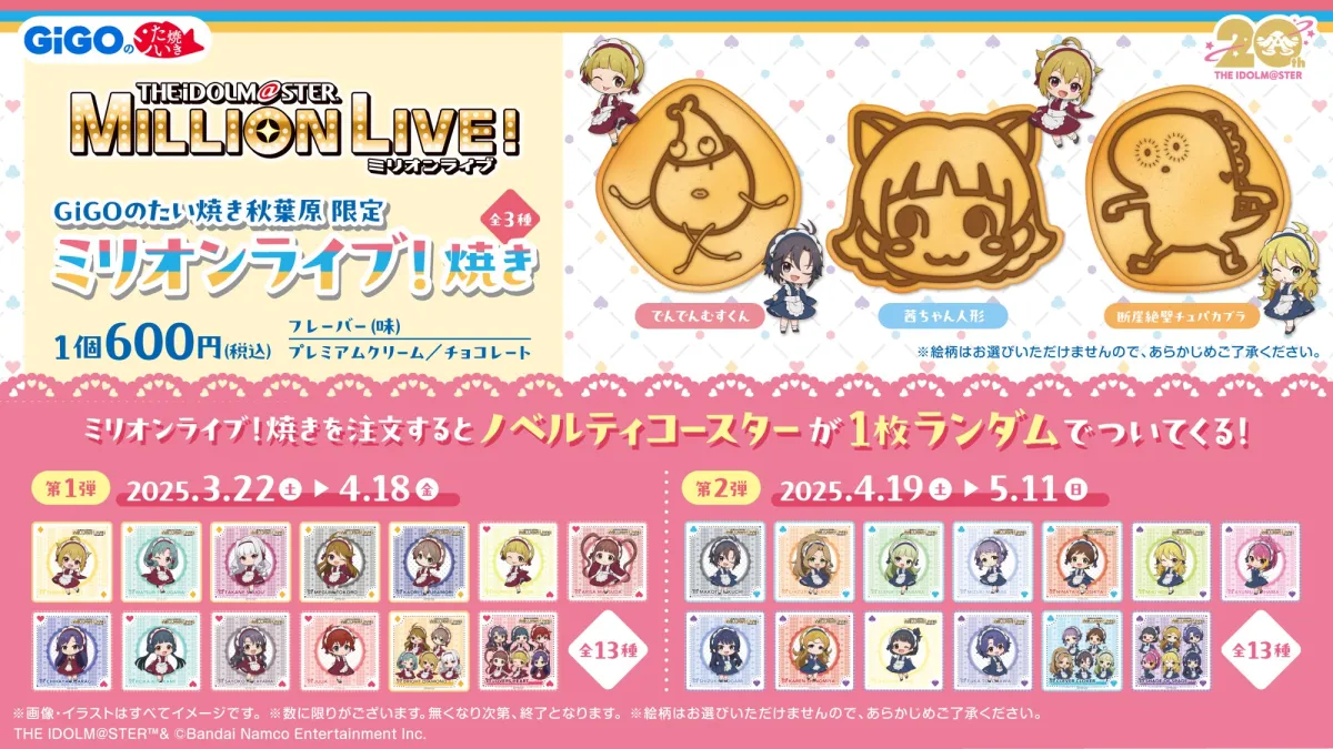 注目のコラボ商品は「ミリオンライブ!焼き」。秋葉原のGiGOたい焼き店で、人気キャラクターをモチーフにしたたい焼きが楽しめます。