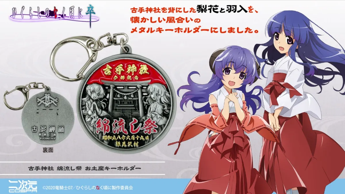 古手神社を背にした梨花と羽入のキーホルダーは、あなただけの特別な商品になるかもしれません!それでは、素敵なグッズとの出会いをお楽しみください。
