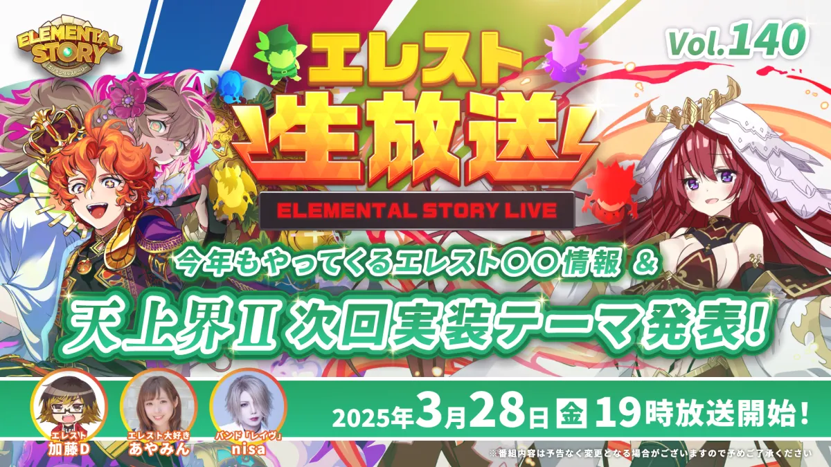 2025年3月28日(金)の19:00から、待望の公式生放送vol.140が配信されます。パズルRPG『エレメンタルストーリー』を展開するStudio Z株式会社が主催するこのイベントでは、ゲームの最新情報が一挙に発表される予定です。