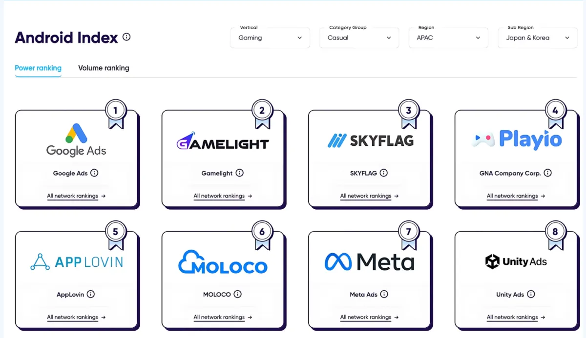 Gamelightの成功は、AppsFlyerパフォーマンスインデックスの評価にも表れています。カジュアルゲーム部門では、日本や韓国、西ヨーロッパを含む複数地域でTop 2の地位を維持しており、全ジャンルを対象としたランキングでは、報酬型UAソースとして世界No.1に選ばれるなど、その実績は顕著です。