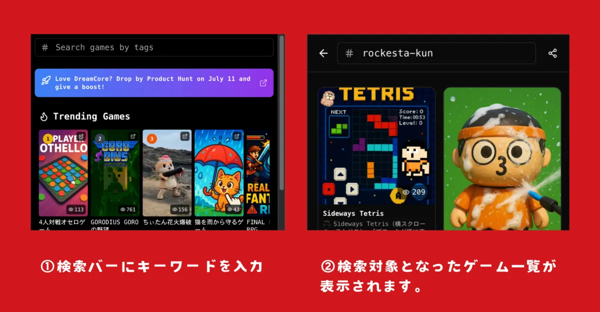 また、タグ検索では、#ホラーや#パズルといった人気のタグで絞り込むことができ、リアルタイムで人気タグのランキングも確認できます。これにより、ユーザーは自分の興味にぴったりのゲームに迅速にアクセスできるようになります。