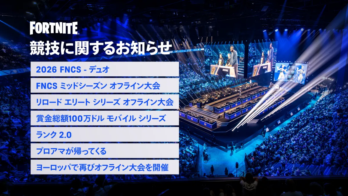 さらに、熟練者から初心者まで多様なプレイヤーが楽しめるように、FNCSミッドシーズンLANやリロード・エリートシリーズLANなど、新しい競技イベントのラインナップも間もなく発表される予定です。これらのイベントは、フォートナイトファンが一堂に会し、強豪たちのプレイを観戦する貴重な機会となるでしょう。