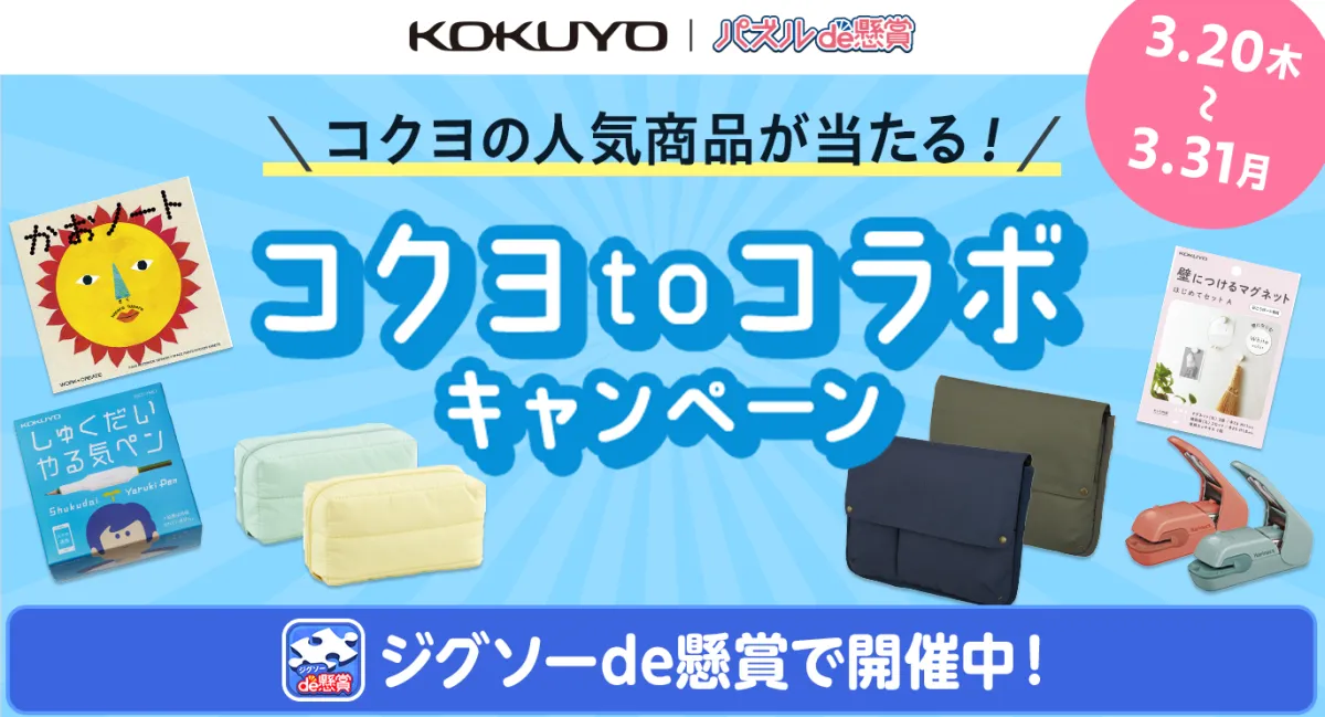 2025年3月20日から31日までの期間限定で、スマートフォン向けアプリ「パズルde懸賞」シリーズが文具業界のリーダーであるコクヨとの2度目のコラボレーションを実施します。コラボレーションの結果、特別な「ジグソーde懸賞」パズルが登場し、プレイヤーはこれを通じてコクヨの人気商品を手に入れる絶好のチャンスを得られます。