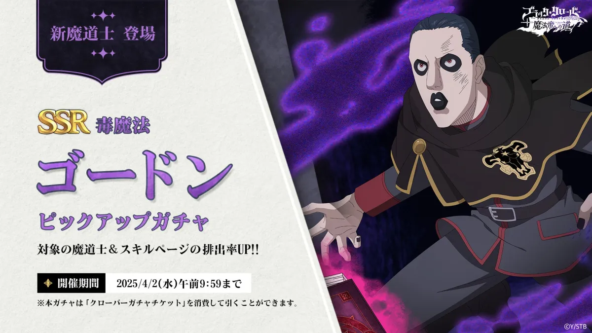 アプリゲーム『ブラッククローバーモバイル 魔法帝への道 The Opening of Fate』が、2025年3月19日(水)より新キャラクターを追加しました。これまでにない魅力を持つSSR魔道士《毒魔法》ゴードン(CV:松田健一郎)がついに登場します!