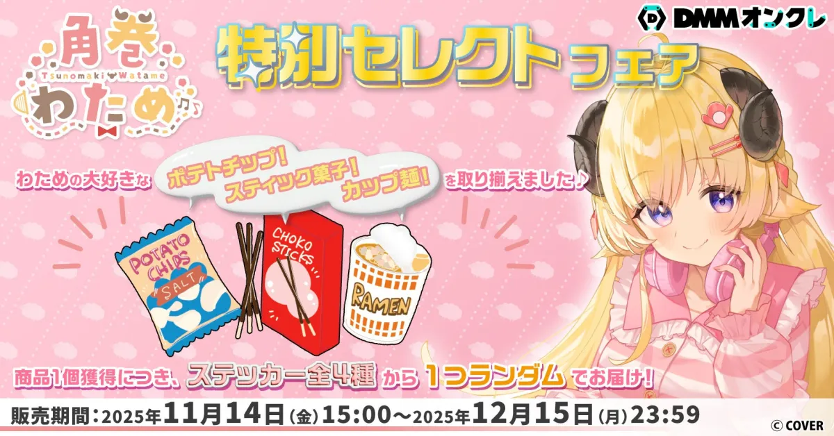 ホロライブに所属する人気VTuber、角巻わための「特別セレクトフェア」がDMMオンクレで行われることが決まりました。このフェアでは、わためが選んだお気に入りの景品、具体的には「ポテトチップ」、「スティック菓子」、「カップ麺」といったお菓子がラインナップされます。2025年11月14日から12月15日までの期間、ぜひお楽しみに!