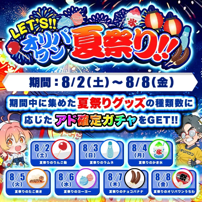 オンラインオリパサイト「オリパワン」が2025年8月2日から8月8日までの間、特別なイベント「LET'Sオリパワン夏祭り」を実施しています。このイベントでは、毎日異なる「夏祭りグッズ」を収集することで、後日行われる「アド確定ガチャ」に挑戦できる特権が得られます。