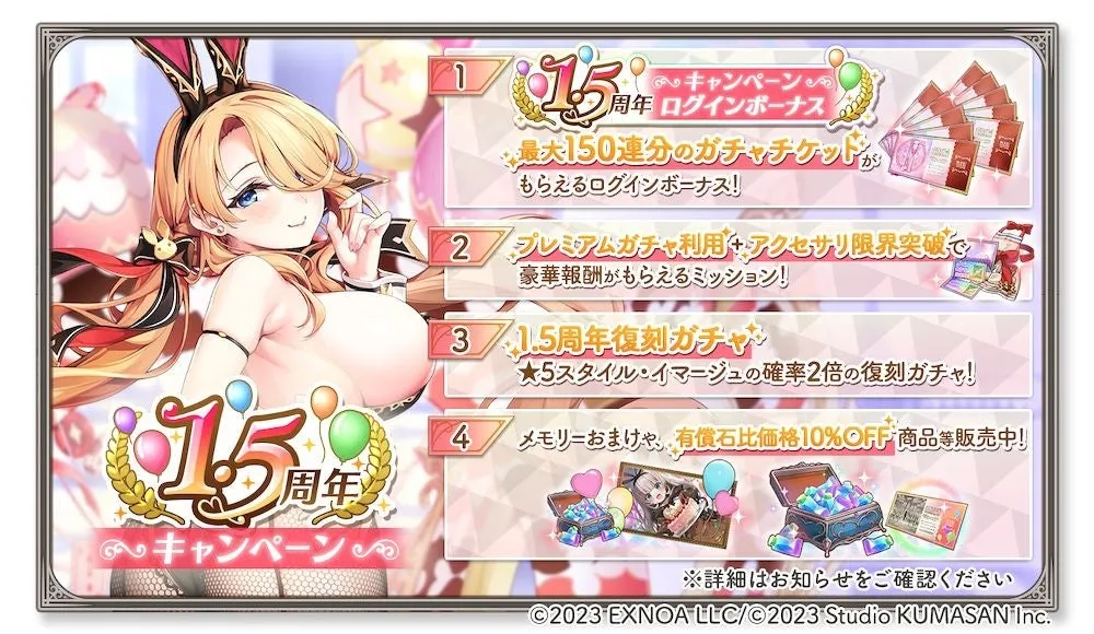 1.5周年を記念するため、2025年4月30日(水)からは、さまざまなキャンペーンがスタートします。特に注目すべきは、ログインボーナスで最大150連分のガチャチケットが提供される点です。また、登場する新機能「専用アクセサリ限界突破」に関連するミッションも用意されており、プレイヤーはこのミッションをクリアして新たな能力を手に入れることができます。さらに、復刻ガチャでは★5キャラクターの入手確率が2倍になる嬉しいチャンスもあります。