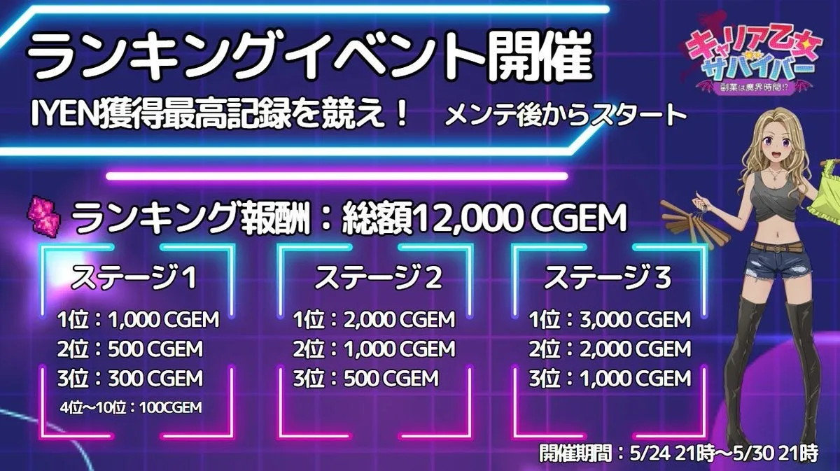 ゲーム情報が新たに発表された『キャリア乙女サバイバー』、通称『キャリサバ』では、初めてのランキングイベント「IYEN獲得チャレンジ」が開催され、プレイヤーたちの熱意が集まっています。このイベントでは、ゲーム内通貨「IYEN」を獲得する最大数を競うもので、報酬として最大12,000CGEMが用意されています。