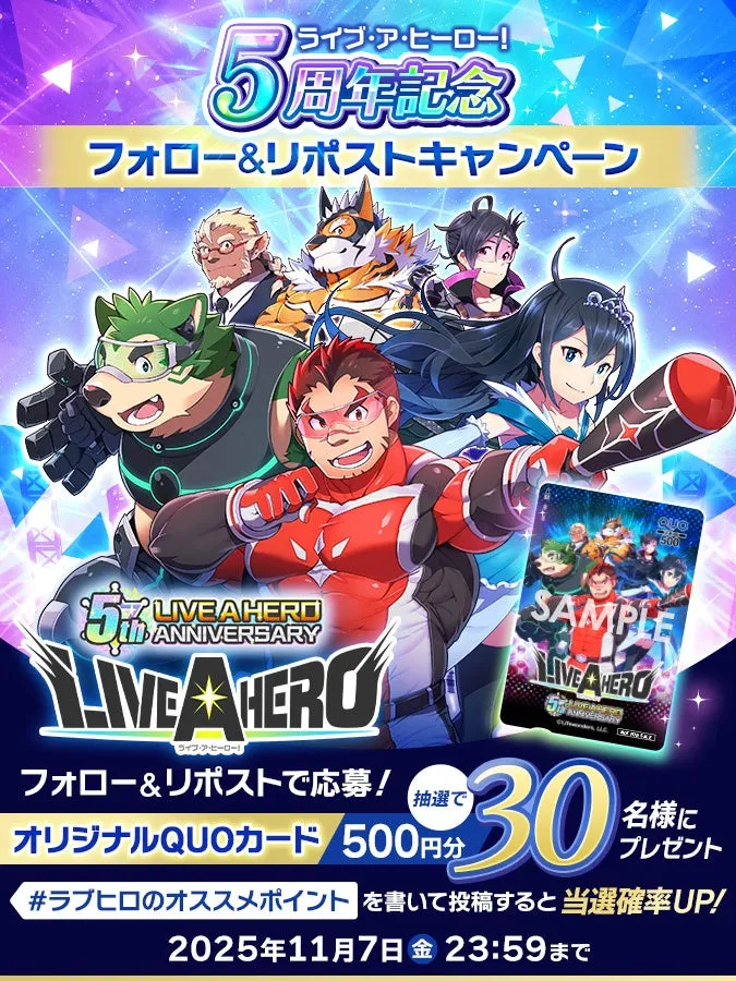 ゲームファンの皆さんに朗報です!『ライブ・ア・ヒーロー!』がこの度5周年を迎え、特別なキャンペーンを開催することが決まりました。このキャンペーンは、フォローとリポストを通じて特製QUOカードが当たるチャンス。期間はフルに楽しめる1ヶ月間です。